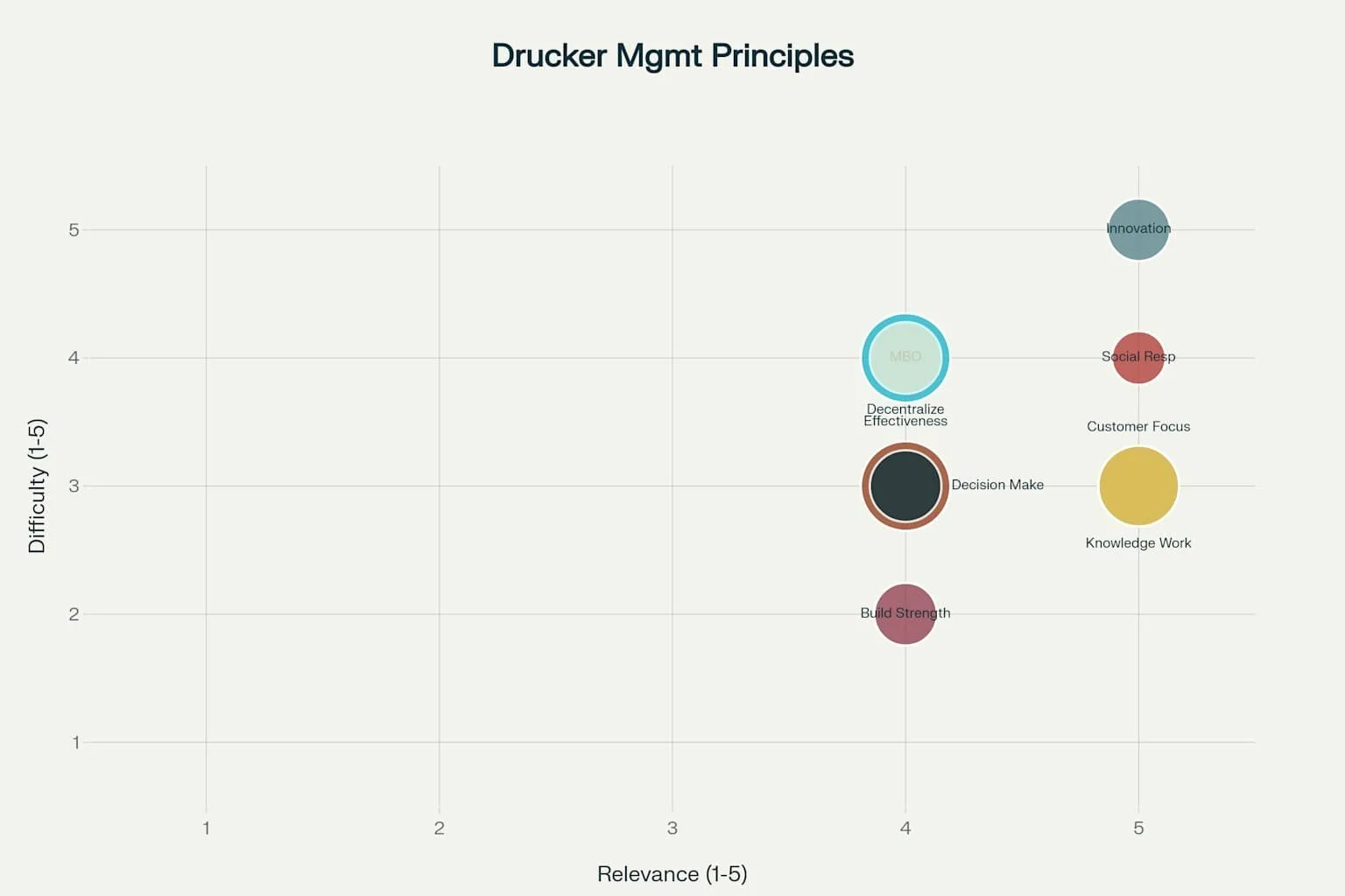 Modern relevance vs implementation difficulty of Drucker's principles, with bubble size representing historical impact