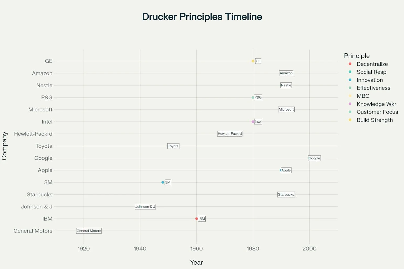 The timeline of corporate adoption reveals how Drucker's principles have evolved and spread across industries over nearly a century. Early adopters like General Motors and Johnson & Johnson pioneered foundational approaches, while modern technology companies have adapted these principles for digital-age challenges.