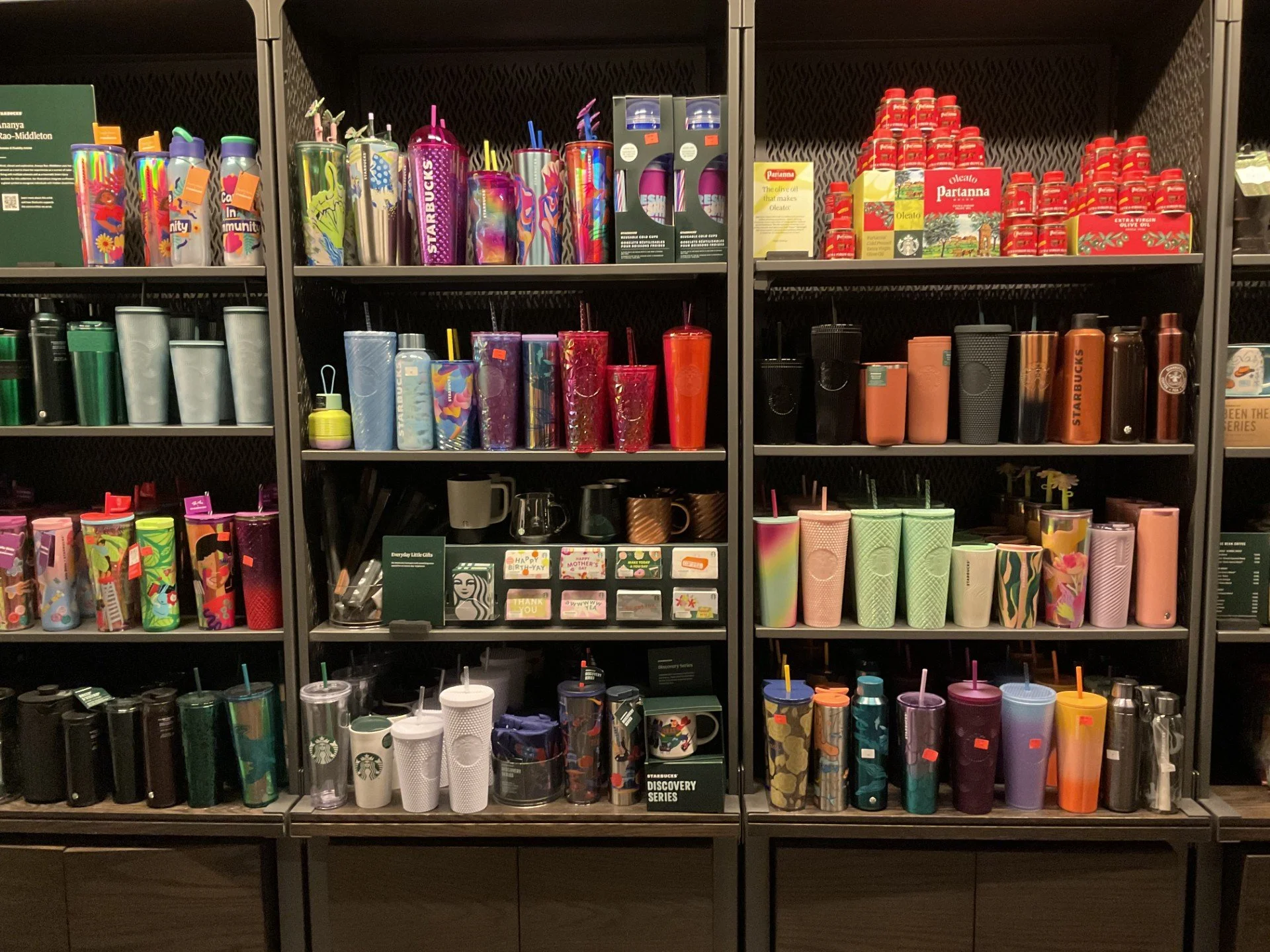 I chose this picture because I think it conveys its meaning well: to display products for sale to those who want to drink something out of a container that makes a statement about some aspect of their taste and personal aesthetic. The pricing stickers are prominent, allowing the viewer to know that the products are for sale. It is worth noting that the price stickers are relatively small, perhaps to draw the customer closer to the products. The products appear to be grouped by color and/or pattern, allowing customers to find what appeals to them and their preferences quickly.
