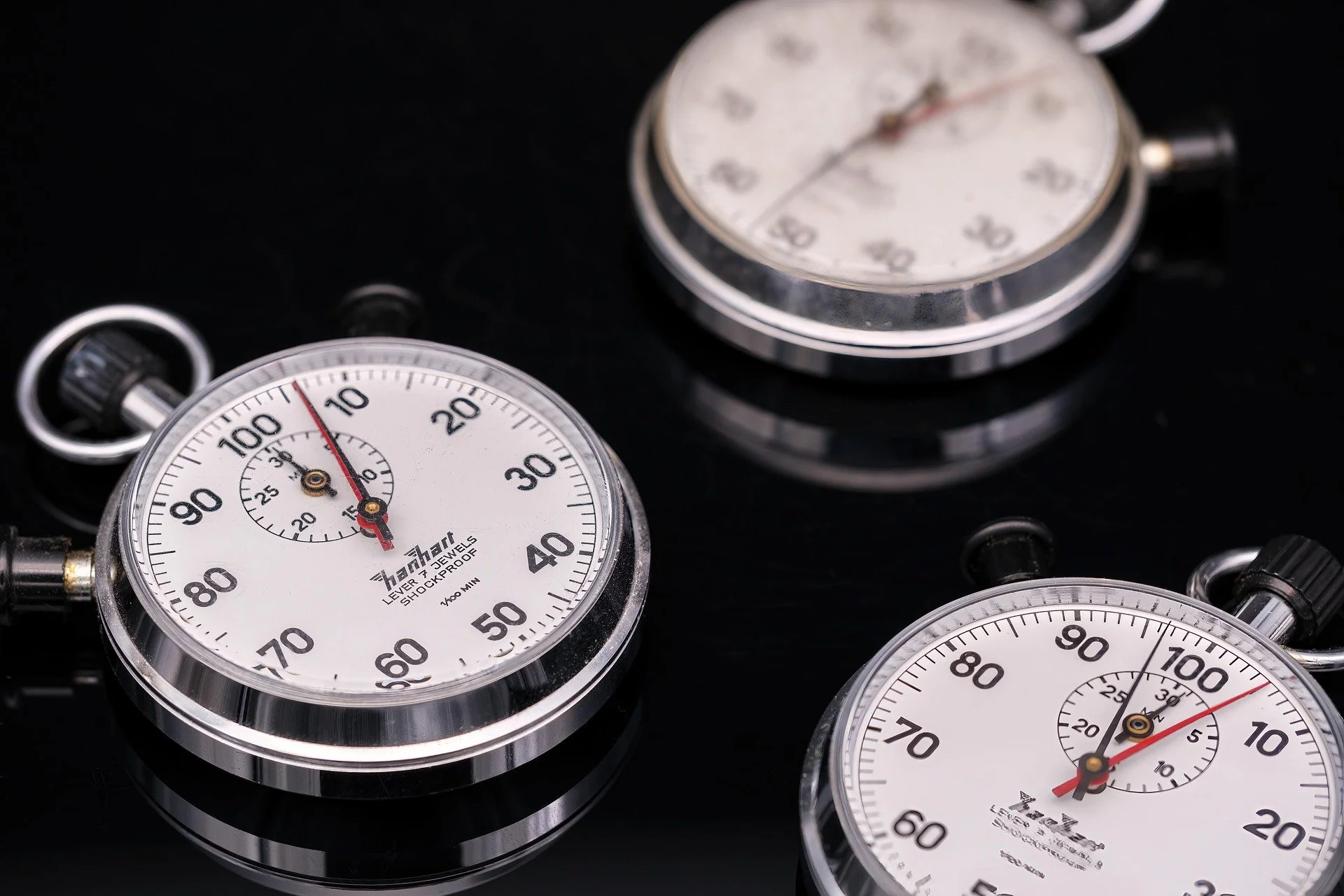 Three vintage stopwatch timers placed on a black reflective surface, with one prominently in the foreground and two in the background.